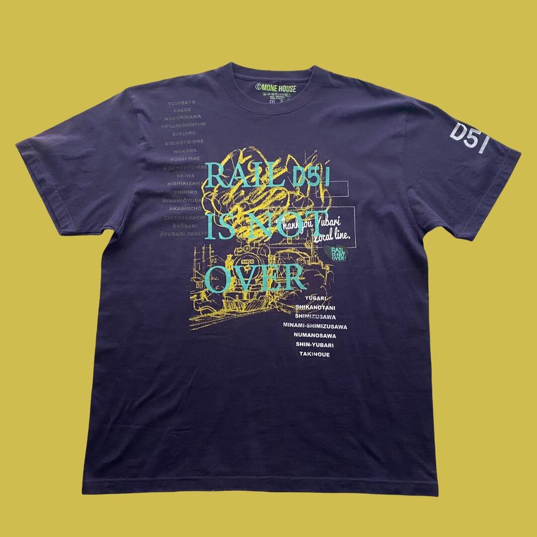 ⚫︎元は夕張支線汽車シリーズTシャツのインクハネやデザイン擦れなどの印刷ミスを起こしてしまったTシャツです。元々シリアル番号をつけている商品の為、そのままアウトレットとしても販売できないので、新たな文字を乗せて販売しています。印刷ミスの目立つ箇所には新たなデザインを乗せて、一つとデザインとして仕上げた一枚になっています。