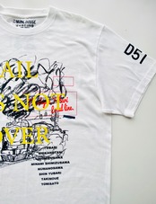 製作途中にインクが飛んでしまったり、印刷ミスを起こして、正規品として出せない場合、そのままアウトレットでも出せないので、本来のデザインを全て載せた後に、フォントや色を変え、文字をプラスして仕上げています。インク飛びなどには、場所によっては上から違うデザインを被せて、新たなワンポイントにしています。